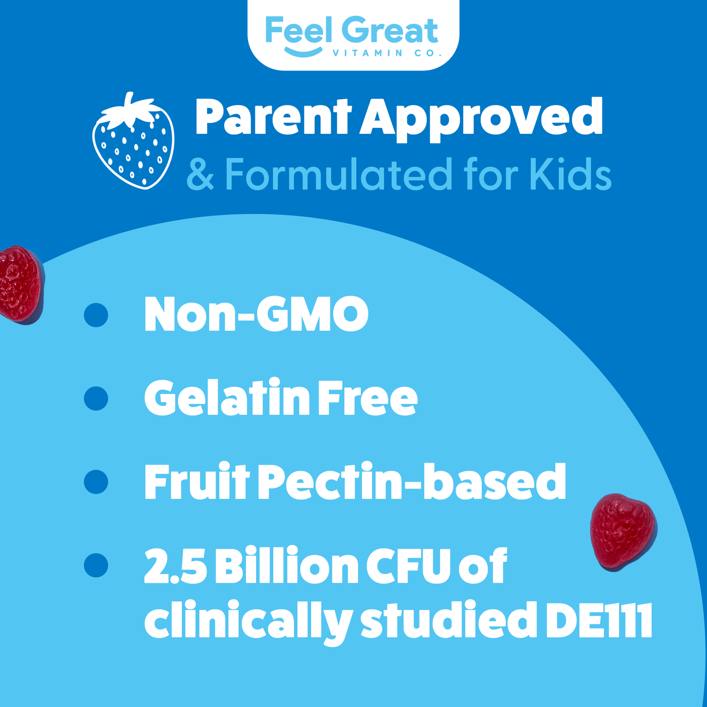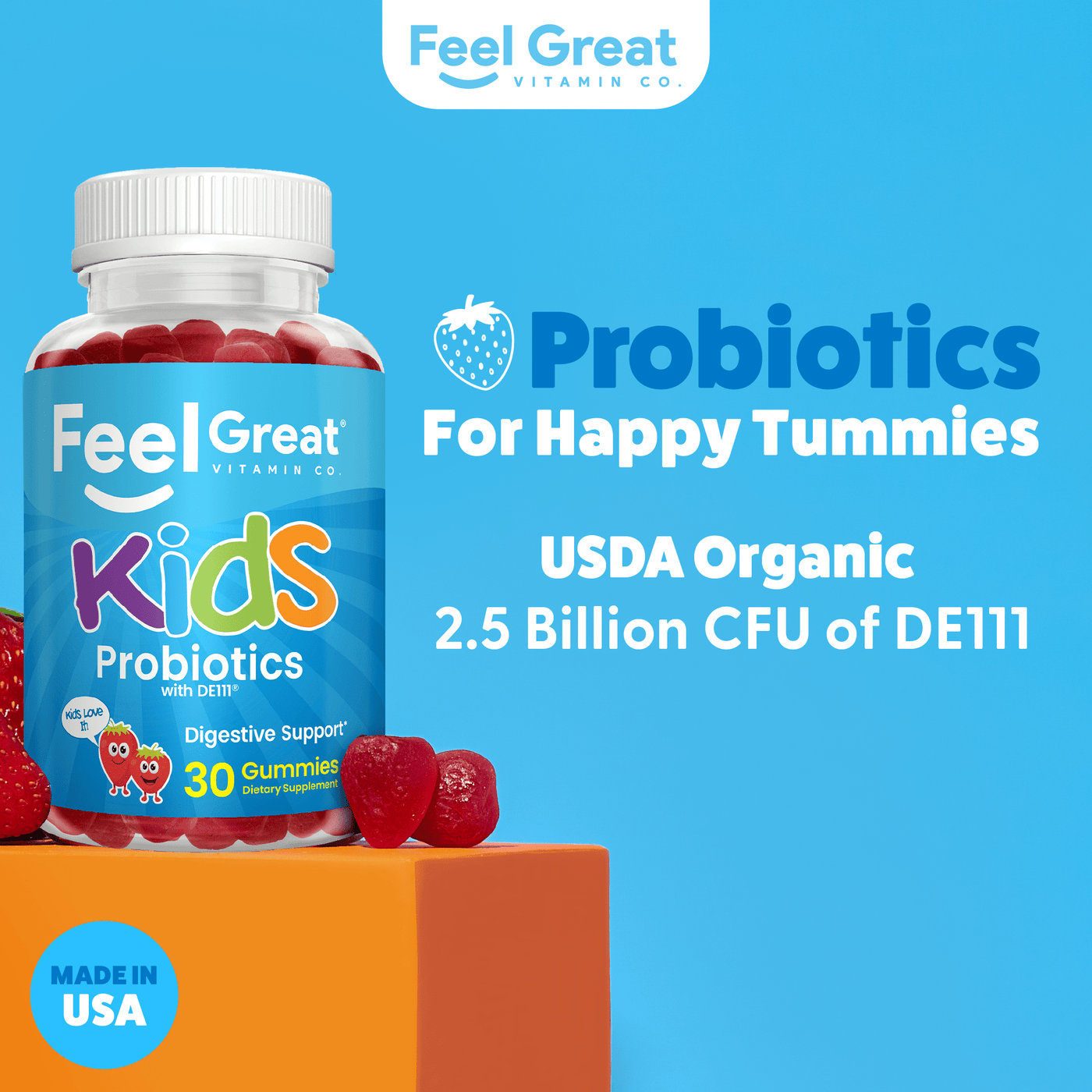Feel Great Vitamin Co’s gummies are pure and potent and we source the highest quality NON-GMO USDA organic real probiotics for maximum effectiveness and safety.