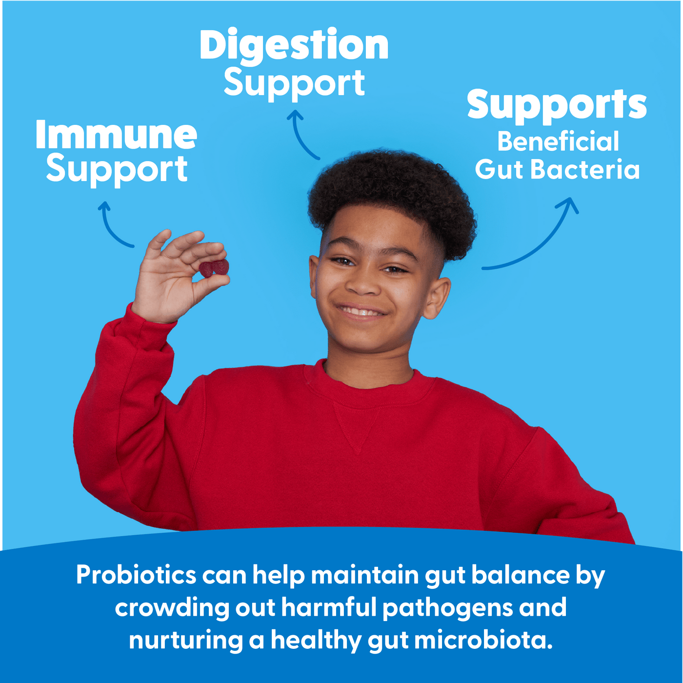 As the good bacteria in your child’s gut, our Probiotic Gummies for Kids help keep intestines healthy*, improve digestion, promote a healthy GI tract*, and support regularity*, and help protect against occasional constipation or diarrhea* and more.*